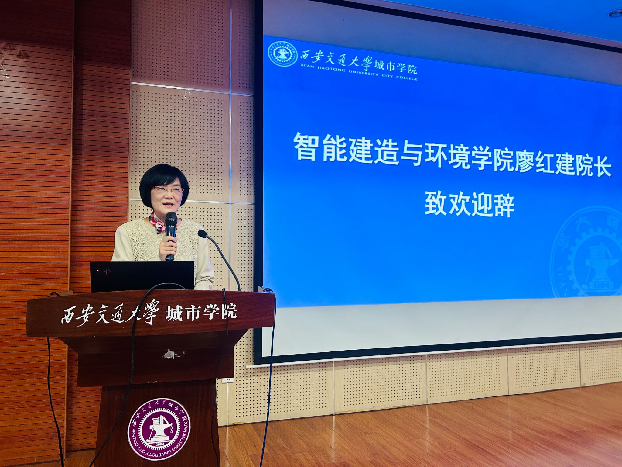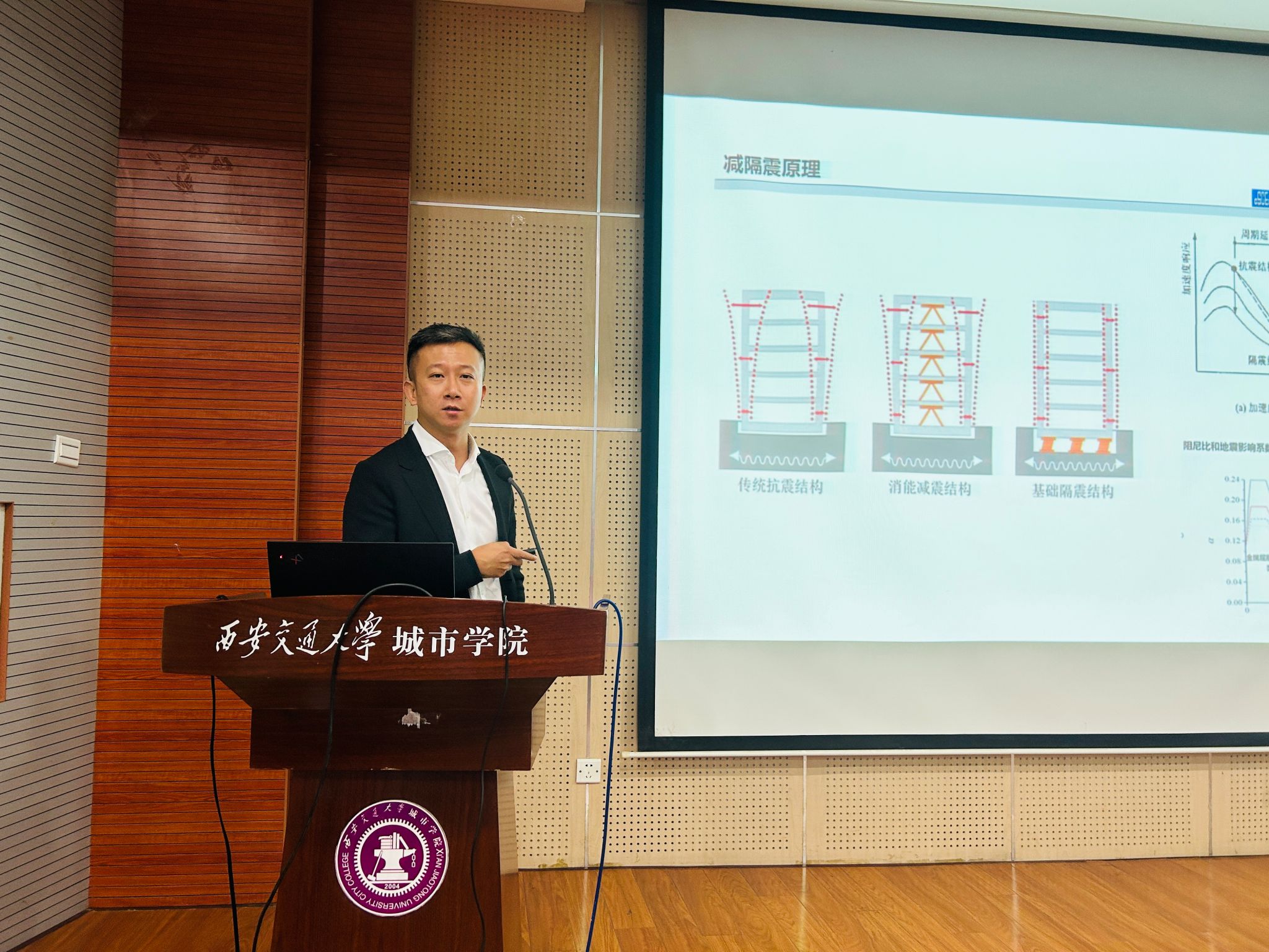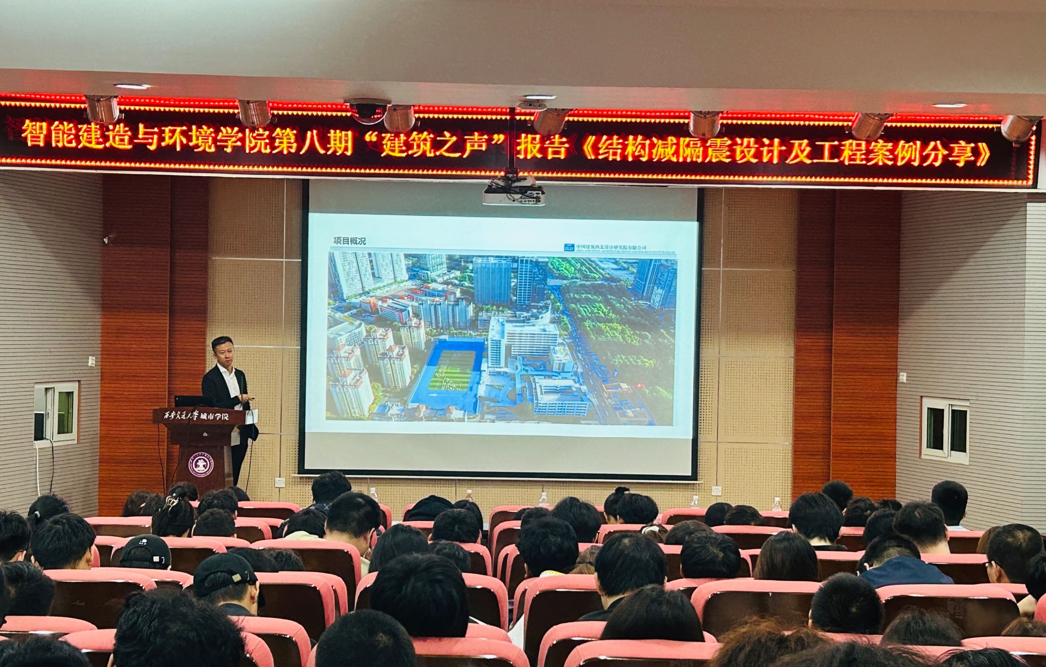 9月24日,智能建造与环境学院在F100报告厅举行第八期“建筑之声”报告会。本次报告会依托智能设计与工程实践创新实验室,特邀中国建筑西北设计研究院有限公司分院总工程师、教授级高级工程师、国家一级注册结构工程师、智能建造与环境学院客座教授潘映兵主讲,报告主题为“结构减隔震设计及工程案例分享”。智能建造与环境学院院长廖红建、副院长黎莹、全体教师及2025级新生和部分高年级学生参加。